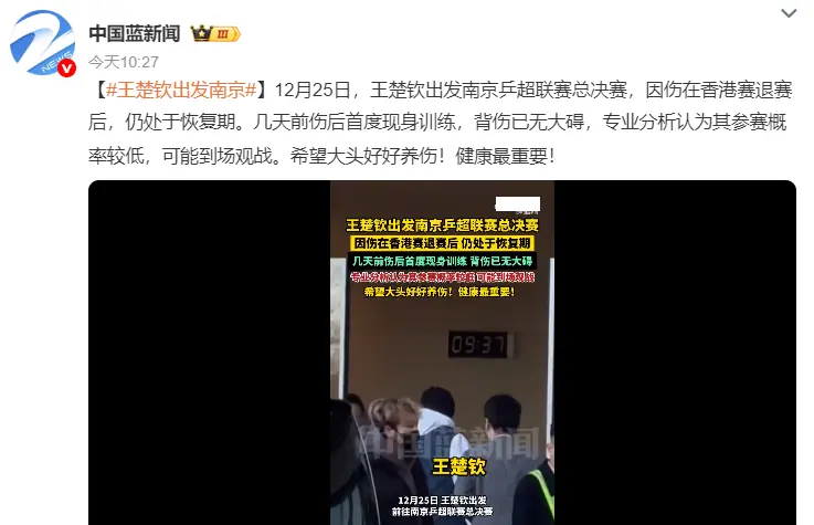 根据浙江媒体《中国蓝新闻》的报道,王楚钦出发南京乒超总决赛,因为王楚钦在香港总决赛因伤退赛,他还在恢复期。几天前王楚钦曾现身训练,背伤已经没有大碍,但专业分析认为王楚钦参赛的概率较低,大概率是在场边观战。