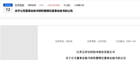 江苏五洋自控技术股份有限公司(以下简称 “公司”)董事会于近日收到公司董事会秘书王镜疑女士提交的书面辞职报告,因工作调整原因,王镜疑女士申请辞去公司董事会秘书职务,根据《中华人民共和国公司法》《公司章程》等规定,王镜疑女士的辞职报告自送达董事会之日起生效。王镜疑女士辞去公司董事会秘书职务后,仍在公司就职。